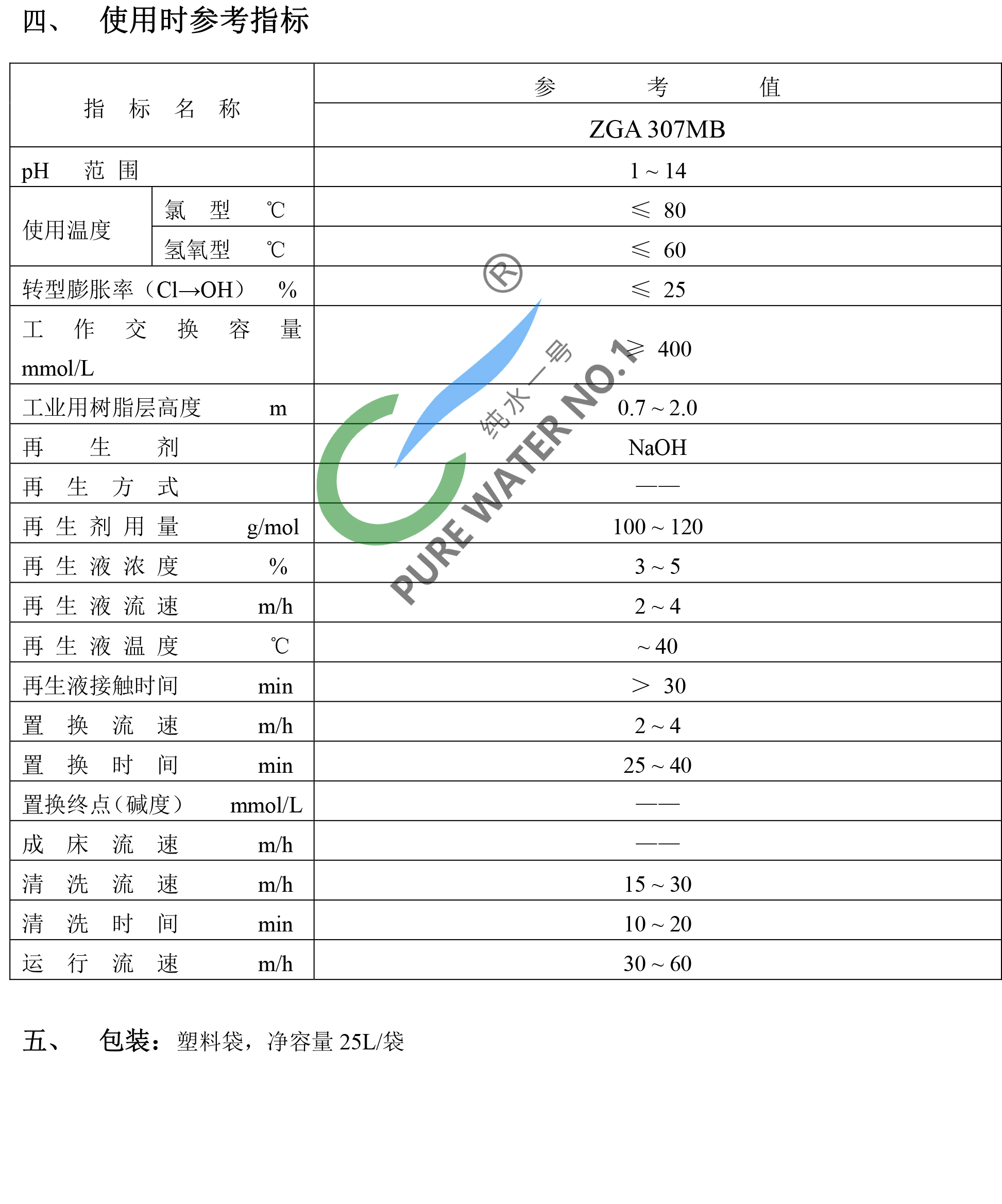 “爭光”牌 ZGA307MB 是苯乙烯—二乙烯苯共聚體上帶有季銨基[—N(CH3)3OH]的陰離子交換樹脂。主要用于純水制備、廢水處理、生化制品及濕法冶金中鎢、鉬的提取。尤其適用于混床系統(tǒng)中純水,高純水制備,具有良好的水力學(xué)特性和物理穩(wěn)定性。